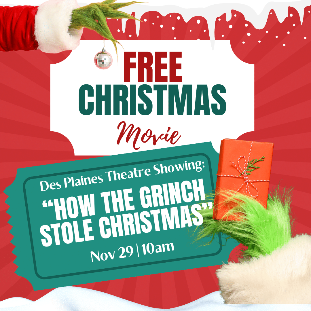 Ignite Your Holiday Spirit at the Des Plaines Theatre’s Ultimate Kickoff Party! Join us on November 29th at 10AM for an unforgettable celebration. You’ll be treated to a FREE screening of the classic “How The Grinch Stole Christmas” followed by an explosion of festive activities, mouth-watering concessions, and enchanting photo opportunities with your favorite characters. Don’t miss out on this magical experience—it’s the perfect way to start your holiday season with a bang! Doors at 9am | Movie at 10am.