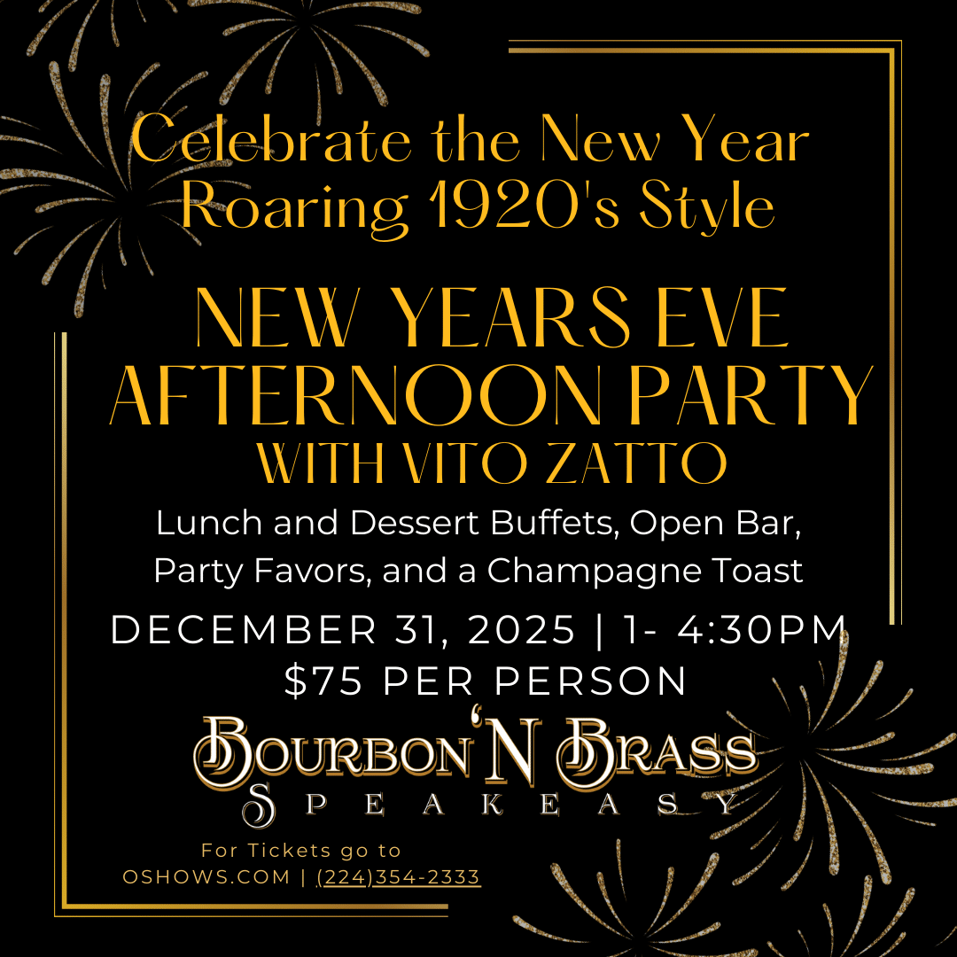 Des Plaines Theatre 1476 Miner St, Des Plaines, IL, United StatesRing in the New Year in our exquisite 1920s Speakeasy! We’ll be celebrating 2026 at our afternoon party in our Bourbon ‘N Brass Speakeasy, located on the 2nd floor of the Des Plaines Theatre from 1pm to 4:30pm. Ticket includes Lunch and Dessert Buffets, Open Bar, Party Favors, Champagne Toast, and Live Entertainment with Vito...