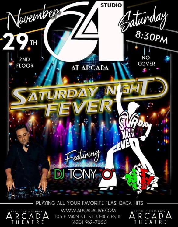 Arcada Theatre 105 E Main St, St. Charles, IL, United StatesStudio 64, located on the 2nd Floor of the Arcada Theatre Complex, is bringing New York's Studio 54 vibe to St. Charles. Join us in a lounge style setting complete with glittered walls and lots of disco balls! It's an Old School DJ Dance Party with a live DJ. There is NO COVER to attend. ...