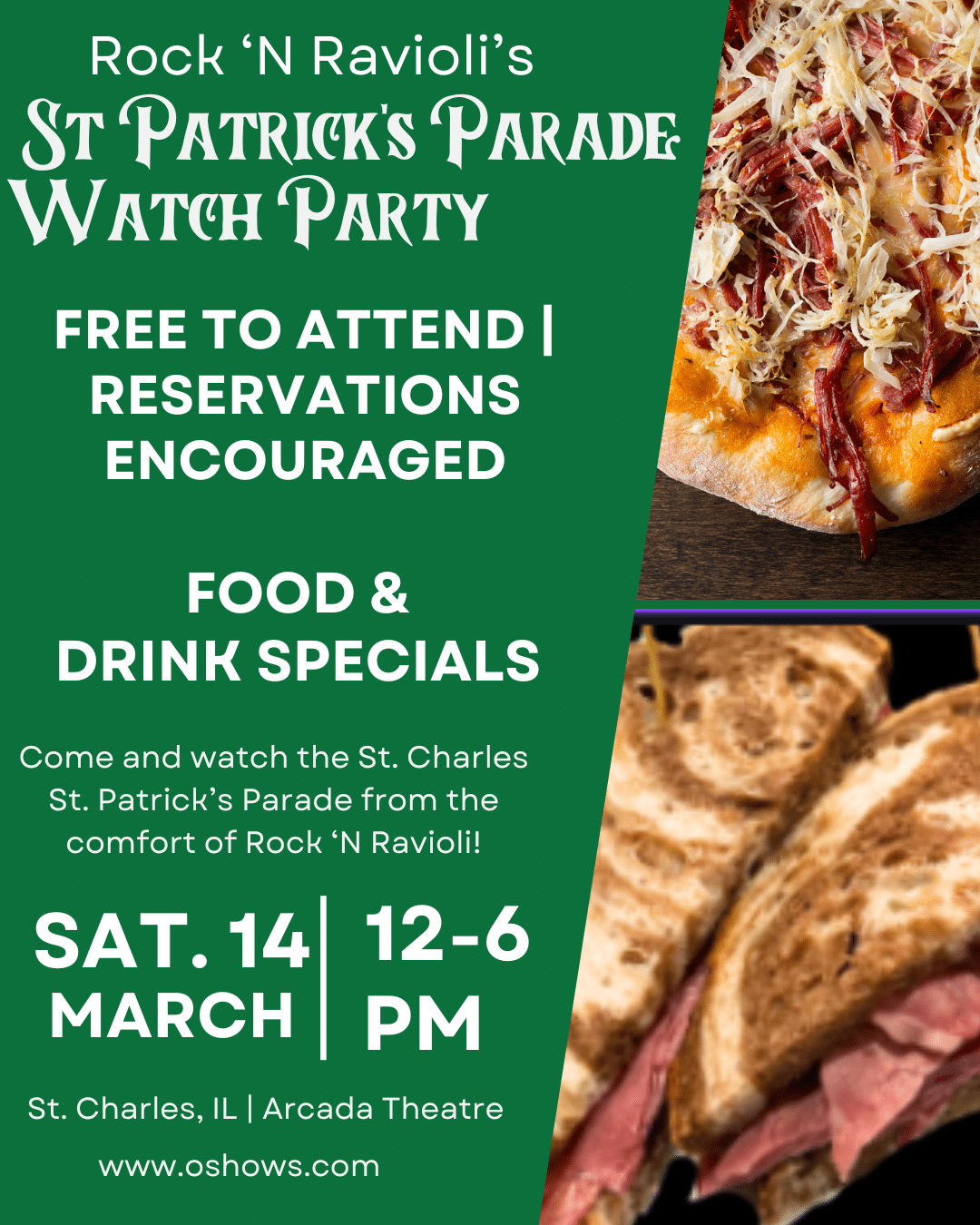 Celebrate St. Patrick's Day in style at Rock n Ravioli! Get ready for a fun-filled parade day with food specials, drink specials, and a variety of festive celebrations. It may be 70 or it may be 30 so join us indoors - the weather will be perfect! We are accepting reservations beginning at noon. The...