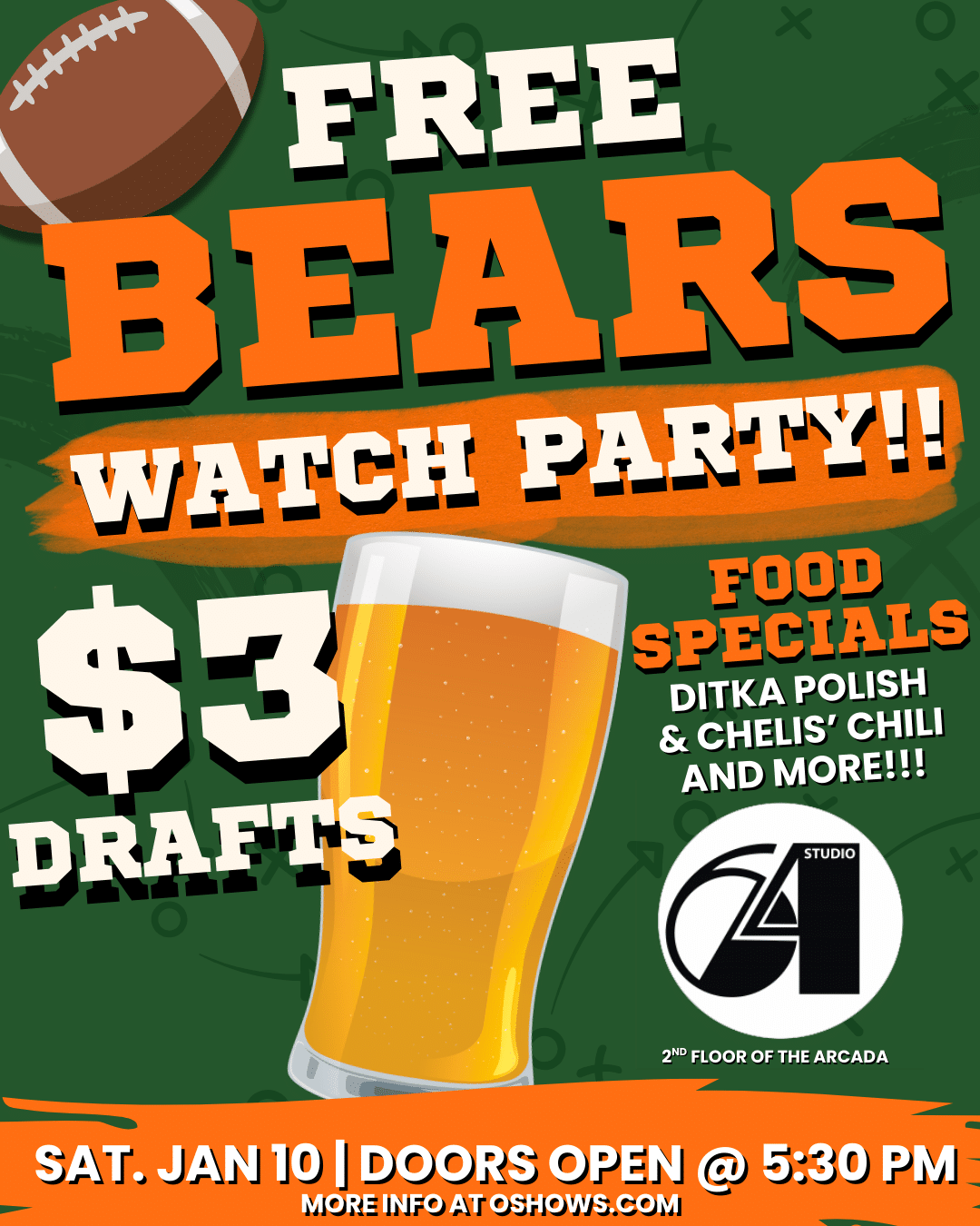Arcada Theatre 105 E Main St, St. Charles, IL, United StatesJoin us for a FREE Bears vs Packers Watch Party. $3 Drafts, Ditka Polish, Chelli's Chili & More!! Studio 64 features a 10-foot video wall TV and lounge-style seating. AND...IF (WHEN) THE BEARS WIN, every guest (present prior to halftime), gets 2 free concert tickets (concert will be pre-selected | tickets can't be exchanged for...