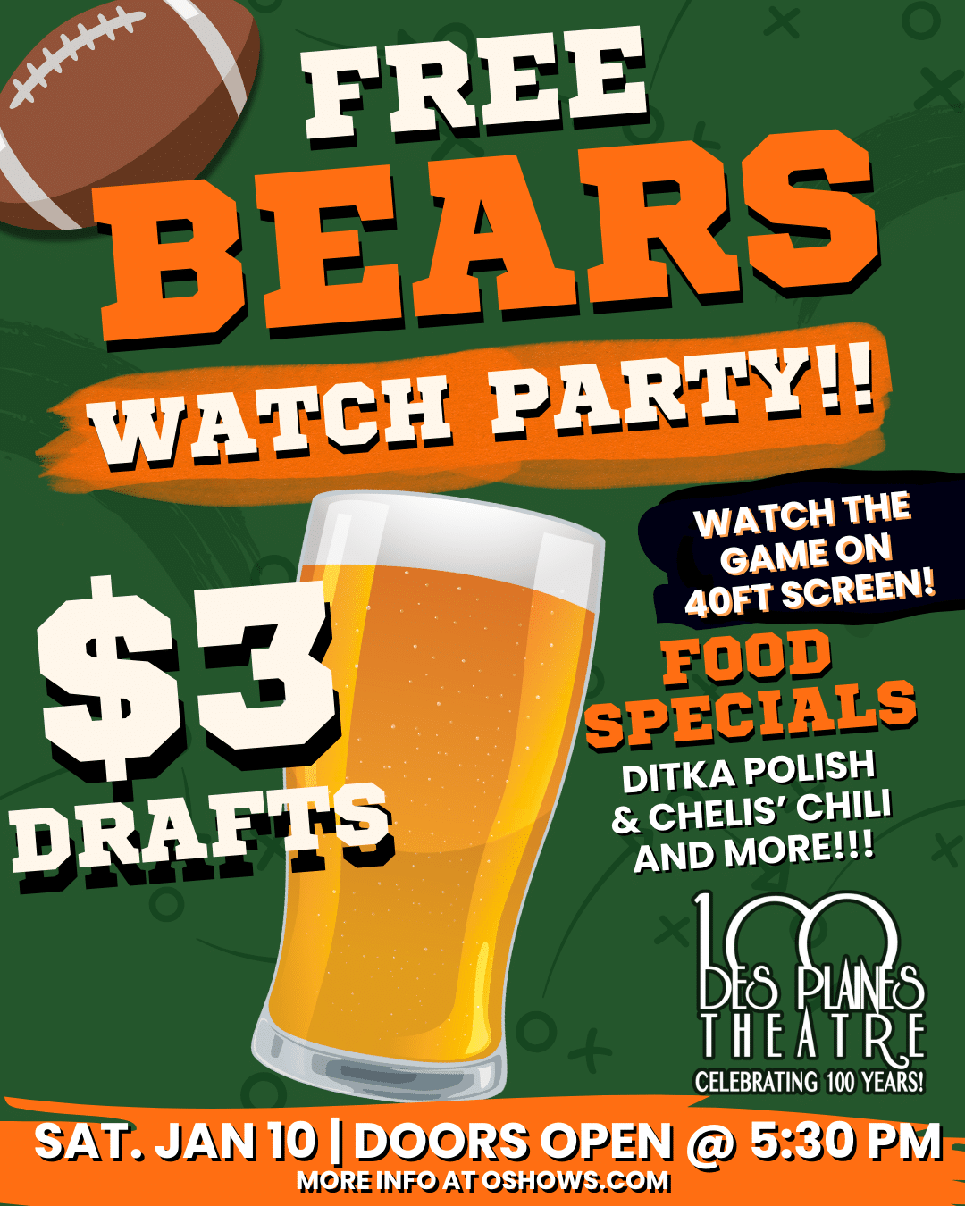 Des Plaines Theatre 1476 Miner St, Des Plaines, IL, United StatesJoin us for a FREE Bears vs Packers Watch Party. $3 Drafts, Ditka Polish, Chelli's Chili & More!! Watch the game on our 40-foot video wall TV and theatre-style seating. AND...IF (WHEN) THE BEARS WIN, every guest (present prior to halftime), gets 2 free concert tickets (concert will be pre-selected | tickets can't be exchanged...