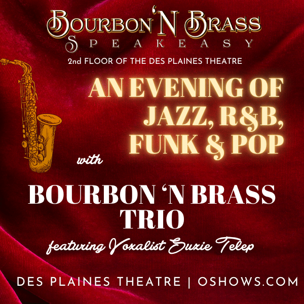 Des Plaines Theatre 1476 Miner St, Des Plaines, IL, United StatesJoin us in our intimate Bourbon 'N Brass Speakeasy, located on the 2nd floor of the Des Plaines Theatre, for an evening of Jazz with the Bourbon 'N Brass Trio featuring Vocalist Susie Telep. Food and hand-crafted cocktails are available for purchase. Happy Hour pricing available all night ($5 Beer | $6 Wine and Call...