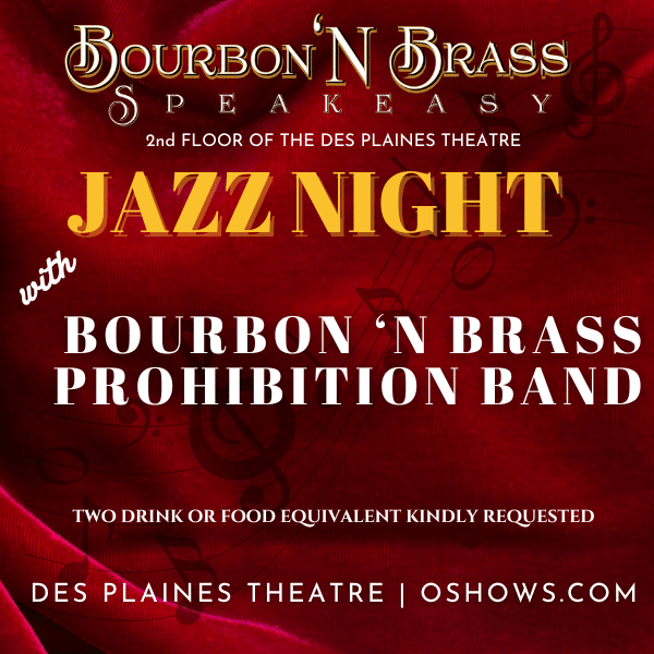 Des Plaines Theatre 1476 Miner St, Des Plaines, IL, United StatesJoin us in our intimate Bourbon 'N Brass Speakeasy, located on the 2nd floor of the Des Plaines Theatre, for an evening of Jazz with the Bourbon 'N Brass Prohibition Band featuring Jack Miuccio! Food and hand-crafted cocktails are available for purchase. There is a $10 entertainment fee which helps us pay the performer. No...