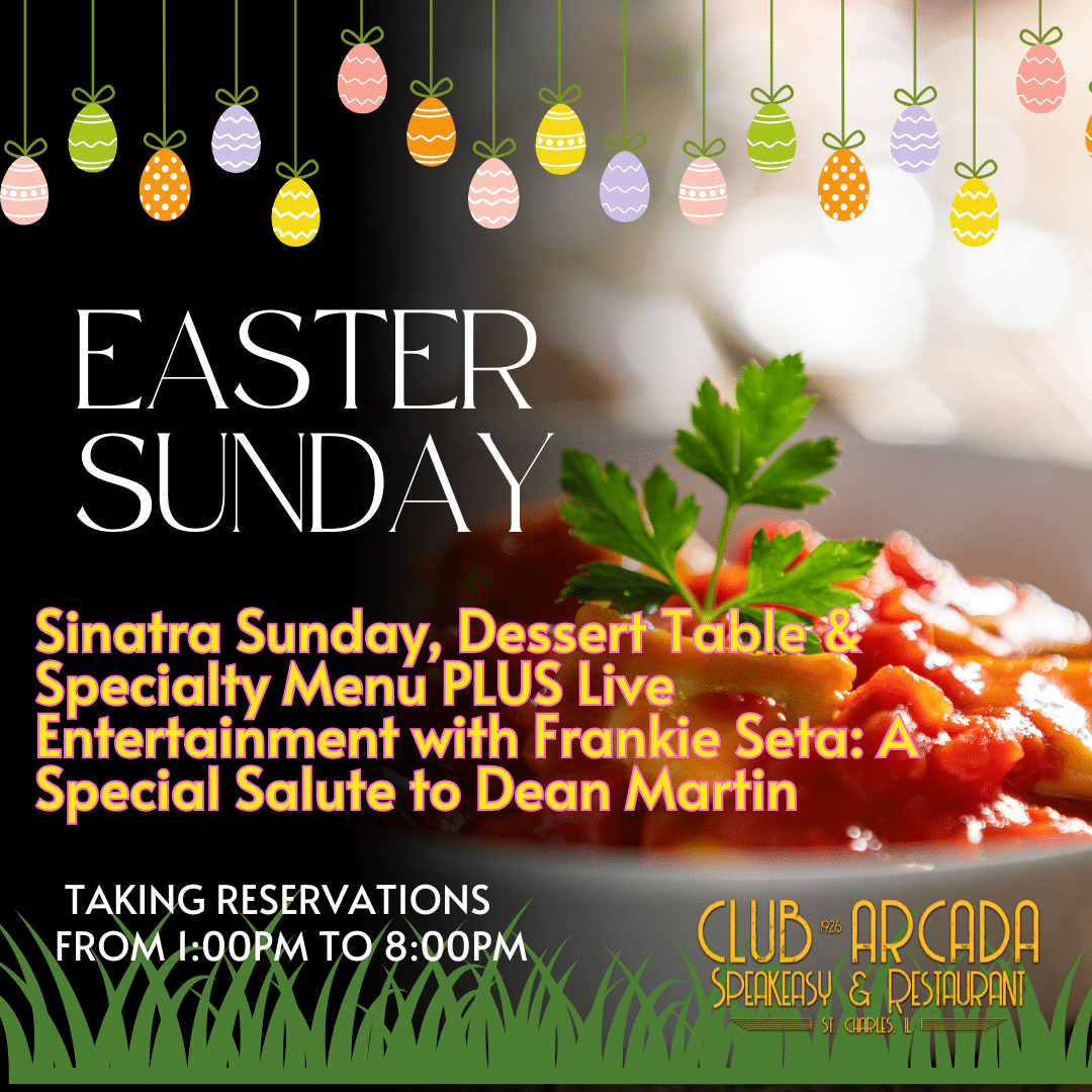 JOIN US FOR A SPECIAL EASTER SINATRA SUNDAY IN OUR INTIMATE SPEAKEASY! Enjoy our FAMOUS Sinatra Sunday Specials, full Cuisine Menu, Easter specials AND Live Entertainment with Frankie Seta and his special Tribute to Dean Martin (1:30pm to 7:30pm)! There is no additional cost for our Sinatra Sunday Entertainment. RAT PACK-AGE SPECIALS: $28.95 ADULTS & CHILDREN...