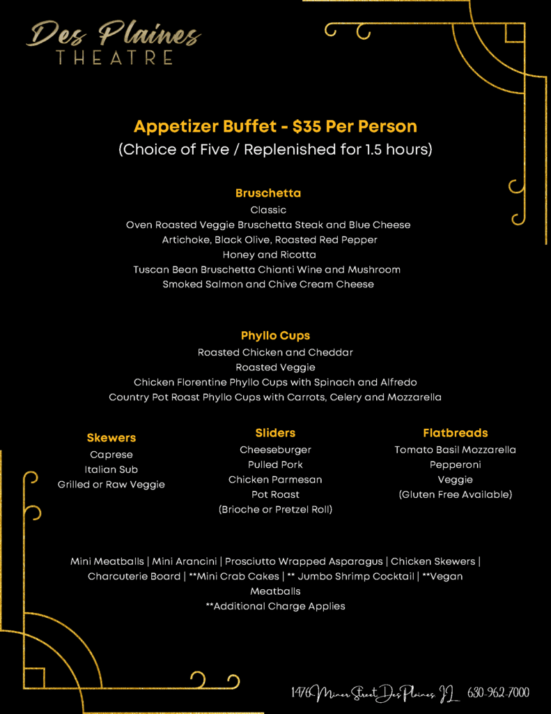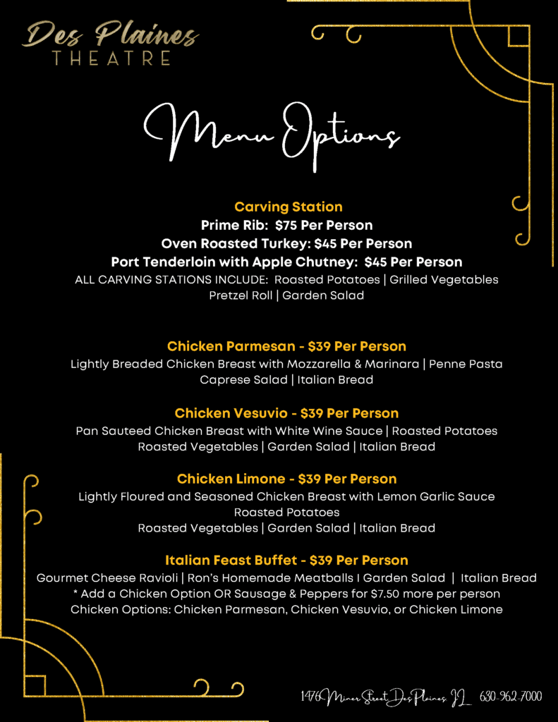 Host an Event at the Des Plaines Theatre Whether you’re planning an intimate gathering, a corporate event or a large celebration, we provide a selection of unique event opportunities to suit every occasion. Capacity: 900 people Reserve your space today! Des Plaines Theatre Catering Menus IMG_4286Eric ChurchScott Vickie WeddingIMG_4889Tavola LungaDancing On Stage 2ScreenshotPiazza PokerBoxingIMG_4283IMG_4278IMG_0795IMG_6979img 3396IMG_0689IMG_4290Gatsby40thPartyIMG_2634Scrolling PhotosIMG_9418 CONTACT AN OSHOWS EVENT PLANNER First NameLast NameEmail PhoneEvent Date MM slash DD slash YYYY Number of GuestsPlease enter a number from 1 to 900.Event Venue(s) Message
