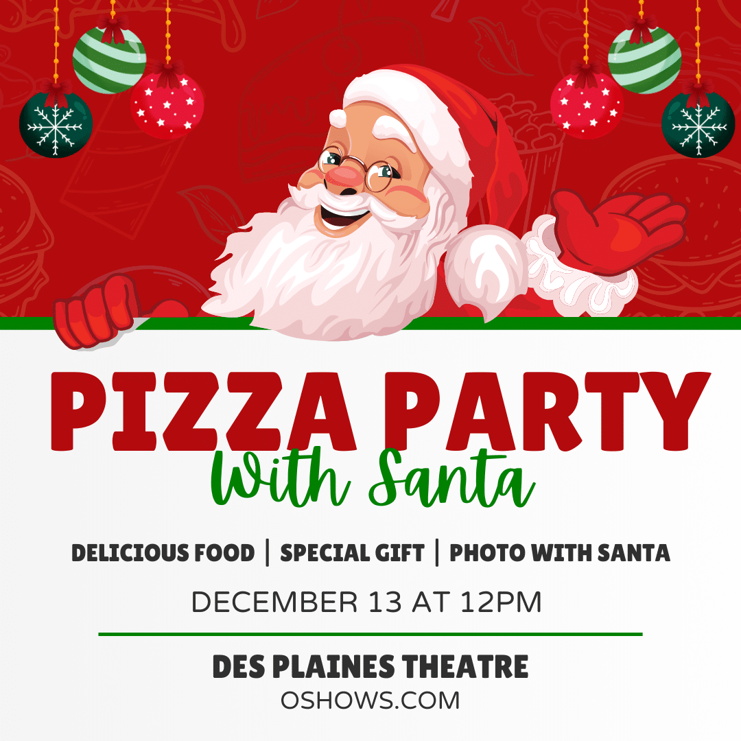 Des Plaines Theatre 1476 Miner St, Des Plaines, IL, United StatesExperience the joy of the holiday season at our Pizza Party with Santa Claus on December 13th at The Des Plaines Theatre! Guests will indulge in a Deluxe Slice of Pizza accompanied by a Soft Drink or Bottled Water and a Mini Dessert Buffet! Following the meal, your family will have the opportunity to meet...