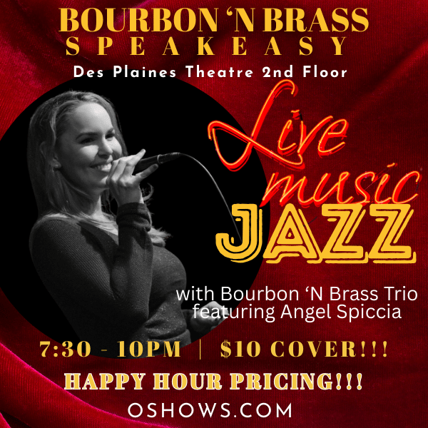 Join us in our intimate Bourbon 'N Brass Speakeasy, located on the 2nd floor of the Des Plaines Theatre, for an evening of Jazz with Angel Spiccia and the Bourbon 'N Brass Trio! Food and hand-crafted cocktails are available for purchase. Happy Hour pricing available all night ($5 Beer | $6 Wine and Call level...
