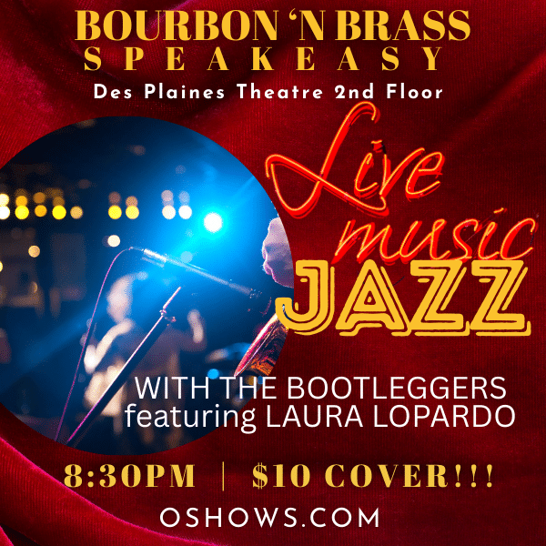 Join us in our intimate Bourbon 'N Brass Speakeasy, located on the 2nd floor of the Des Plaines Theatre, for an evening of Jazz with The Bootleggers featuring Laura Lopardo on vocals! Food and hand-crafted cocktails are available for purchase. There is a $10 entertainment fee which helps us pay the performer. No RSVP required. ...