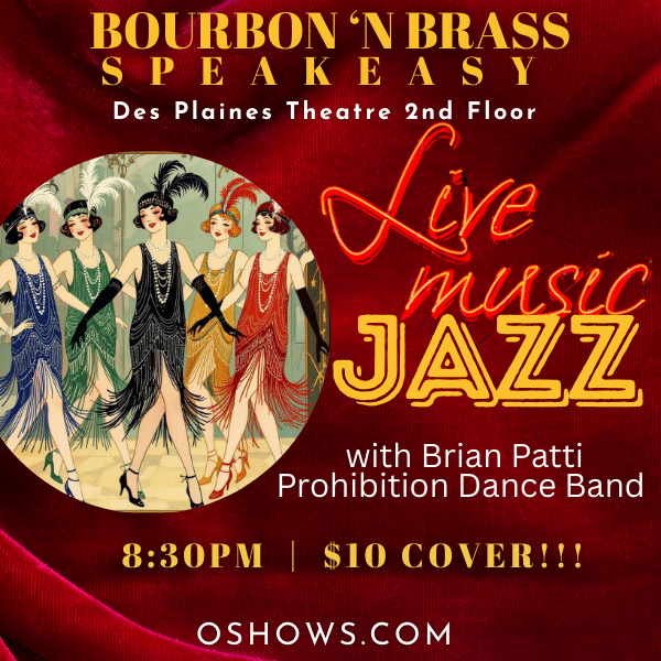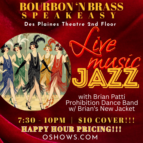 Join us in our intimate Bourbon 'N Brass Speakeasy, located on the 2nd floor of the Des Plaines Theatre, for an evening of Jazz with the Bourbon 'N Brass Brian Patti Prohibition Band! Food and hand-crafted cocktails are available for purchase. Happy Hour pricing available all night ($5 Beer | $6 Wine and Call Level...