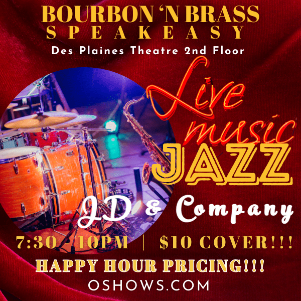 Join us in our intimate Bourbon ‘N Brass Speakeasy, located on the 2nd floor of the Des Plaines Theatre, for an evening of Jazz with JD & Company! Food and hand-crafted cocktails are available for purchase. Happy hour pricing available all night ($5 Beer | $6 Wine and call level cocktails). There is a $10...